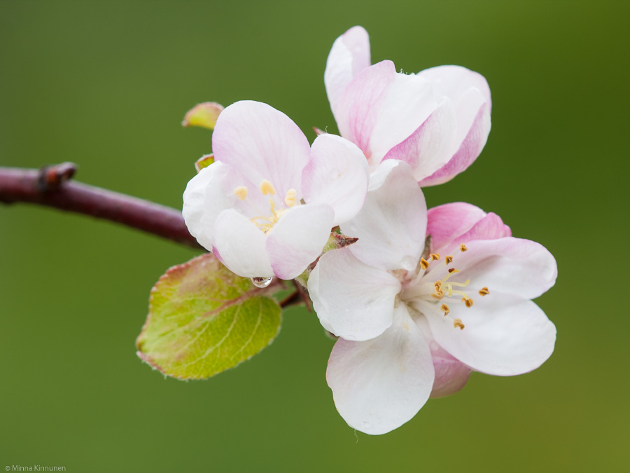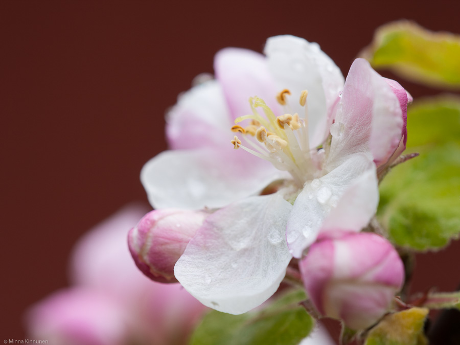 Then it started raining and I figured I might be able to do something about the raindrops on … whatever I could find around the house. I found a small apple tree in bloom in the garden, the big ones are already over bloom but this little one is quite literally a late bloomer. Because of the small size of the tree which means lack of branches, it was easy to isolate the blossoms to get smooth backgrounds. As I was circling around the tree and got the green background in one direction and the red wall of my house in the other, I realised that I probably like the smooth background more than the subject. I think I could easily just shoot 100% out of focus, no subject, just colour, and be happy. How much more quiet can a picture get? Not sure if anyone else would understand though…