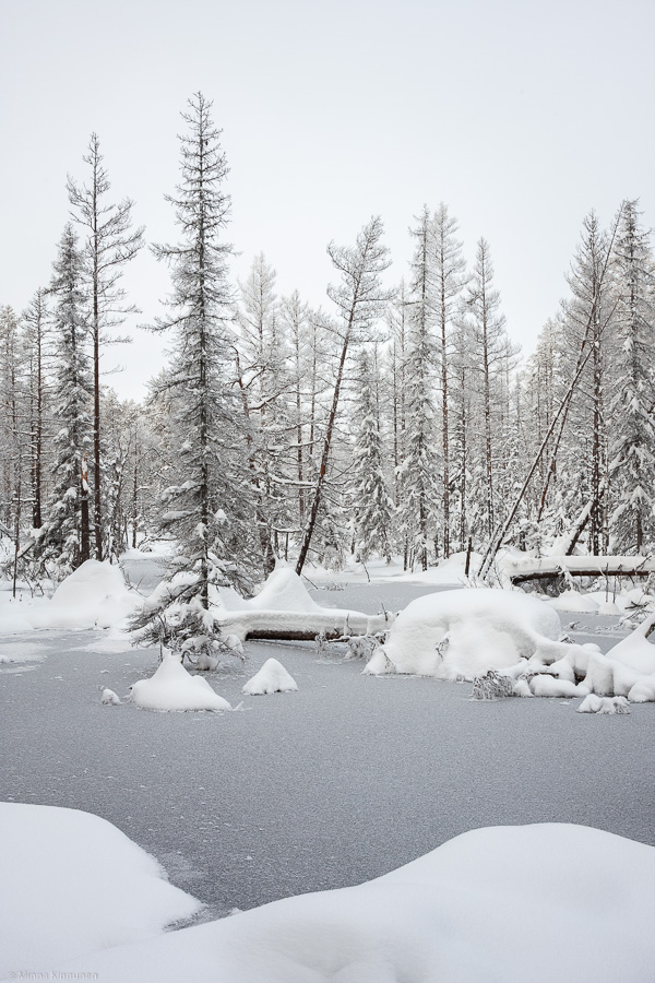Today’s target was Kvarnsjön. The trail there was the same old same old but at the lake, I found something new. I’ve often mentioned the creek that flows out from the lake (in the east, reached from the road), but at the west end of the lake where the trail leads there’s another creek and I decided to follow it upstream. It’s been cold enough for the creek to ice over apart from a few fast flowing sections, but I was still amazed by what I was seeing. There’s so much potential that I’ll be visiting again, maybe in March when the temperatures allow the creek to stay open, and then some new snow to decorate the trees… it will look nothing short of gorgeous!