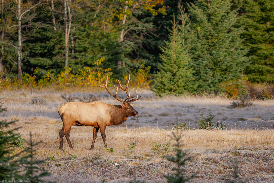 Already on the highway 1, we saw a bus pull on the side of the road. We decided to check out what they had noticed, and found ourselves looking at the biggest elk bull I have even seen. A gorgeus 12-pointer and my 300mm had some work to do.