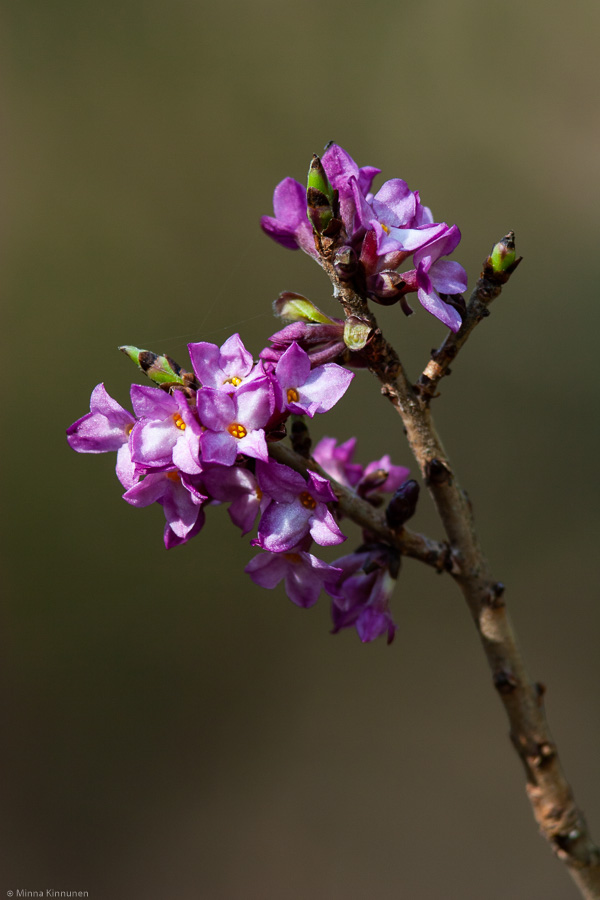 I think that daphne is a special flower. It grows early in the season, it grows straight from the stem in small trees and the scent is enchanting. I could smell the flowers long before I saw them and although I’m normally not a friend of strong scents, I make an exception with daphne. But as intriguing the flower is to experience, as difficult it is to photograph. Normally the flowers form a thin long bloom; it’s a compositional challenge, as framing a long stalk makes for a static image even if you find a diagonal one or deliberately tilt the camera. It also grows high from the ground so including any context is difficult (yes, said by someone who normally tries to isolate the subject from the context). Not to mention that this high position makes the plant very susceptible to wind so a calm day or a lot of patience is required. To top it all off, you have to watch your exposure. The petals have a rough texture which reflects the least bit of light, so the pictures may turn up overexposed even when you carefully metered the flower and underexposed half a stop.I was lucky to get a relatively calm day so subject movement wasn’t a problem. My challenge for the day was to find an ”un-daphne” like bloom to overcome the flowers-on-a-stick issue. When I finally found it, it almost composed itself – a split branch with flowers on both sides to fill up the frame. All I needed then was to wait for the light to happen, which took a while because my daphne grows in the forest so the light is patchy and fleeting. The end result? A daphne image I am finally happy with, but as always, I’m already thinking how I could do it better!