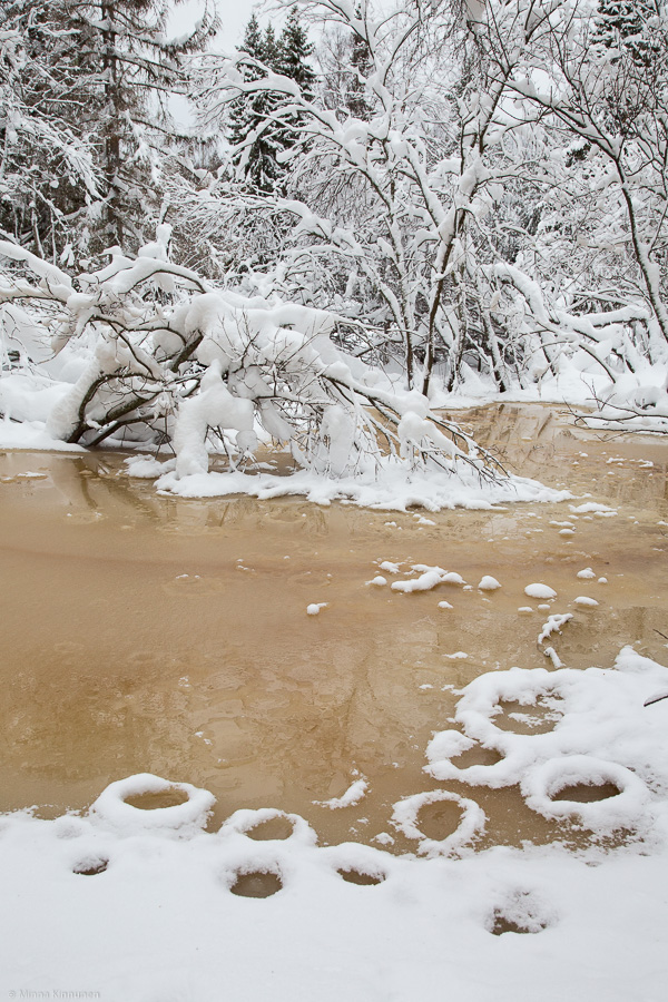 When I moved to Föne in March and made my first trips towards the river, I was wondering about the ice on dry ground. I saw it both by the river and also along the small creek that runs through Föne. Last week when I took the small bridge over the creek, the water level was approximately like it was all summer and autumn. But today, it was flooding over the banks. There’s no flooding going on in Ljusnan that I know of so I’m pretty sure that there is an ice dam further downstream the creek. I would love to know what it looks like in Mon at the moment (Mon is the place I’ve been calling ”flood plains” but last week I finally found out what the locals call it) but the snow is too deep so I have to wait for the snowmobiles to make their way down there so I have some tracks to follow. I always thought that the creek was overflowing because of the river, kind of causing a backwards flow in the creek, but now I suspect that they are separate. The creek is a causing a local flood while the river is at normal level.
