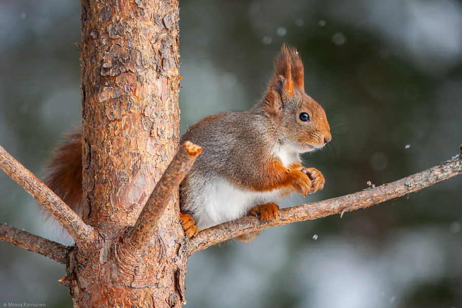 But the squirrels do get their share anyway, and today was just about the best squirrel photography day I’ve ever had. The sun was shining from behind a thin cloud cover, casting a light that was not strictly sunshine but it was definitely not overcast either. To top it off, that thin cloud cover produced a light snowfall so I got some snowflakes to decorate the pictures. I’m gonna have to get back to these pictures in a few days… sometimes it’s hard to have an opinion right after the shoot. But I still have a feeling that these are among the best squirrel pictures I’ve taken so far!