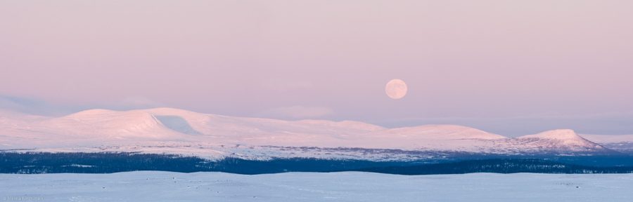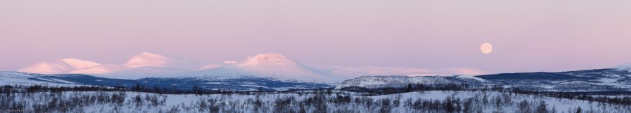 I left the cabin after 8am and drove to my selected moonset spot with a view towards Skarsfjället, Mittåkläppen and Stor-Axhögen. When I arrived, the moon was still high above Mittåkläppen but it was making its way down between the mountains, which forced me to create veeeery long panoramas. Yesterday morning the moon was setting right next to Stor-Axhögen, but like I mentioned earlier, the clouds spoiled the opportunity.