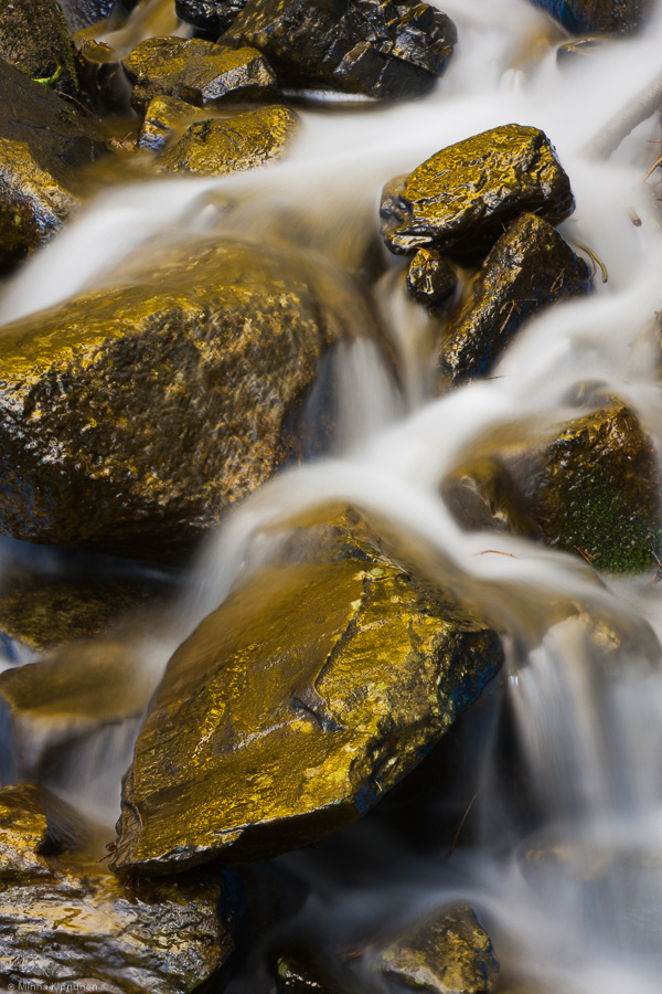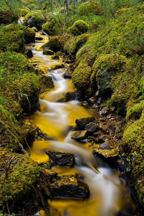The gimmick that I had packed was my blue/yellow polariser. It’s been ages since I’ve used it, and to be honest, any gimmick filter is best used with care and seldom. The last time I used it was in the winter a few years ago so using it now in the spring and in the forest was new for me. It was a useful experience because I discovered that the polariser works magic on the bland looking mosses. Just compare the first picture with the third one, there’s a world of difference in the moss. The white balance in both pictures is set by picking a custom balance from the white water. So I was thinking, in the future, I could take one picture with a normal polariser for the water, and a second one with the b/y polariser for the forest and then combine them to get rich green mosses and natural looking water.