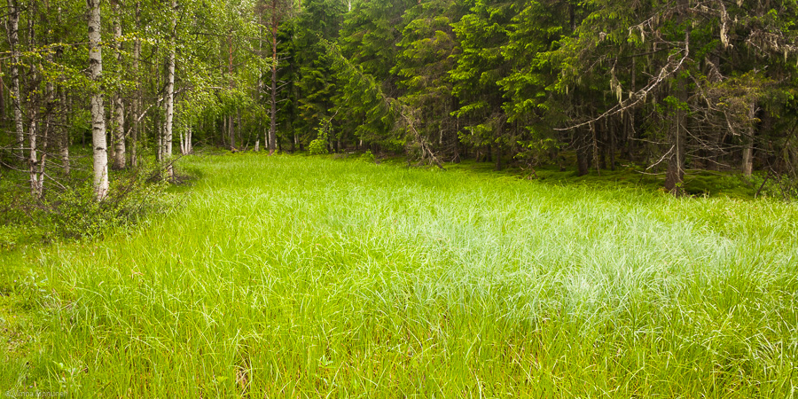 There’s a small creek that runs through Föne, and as it winds down towards Ljusdan, it is surrounded by similar ”flood plains” as the big river, except in smaller scale of course. Many of these old riverbeds contain a little bit of water to support all kinds of grasses, creating this illusion of a green river. In the picture, some of the grass is almost blue though… it really is its colour, not glare. The spruce forest is covered with green mosses, I couldn’t find any good compositions today so I need to visit the place yet again. At least it’s close to me, if I take the bicycle it’s mostly downhill so I pretty much just roll down there… a bit harder to come back but never mind.