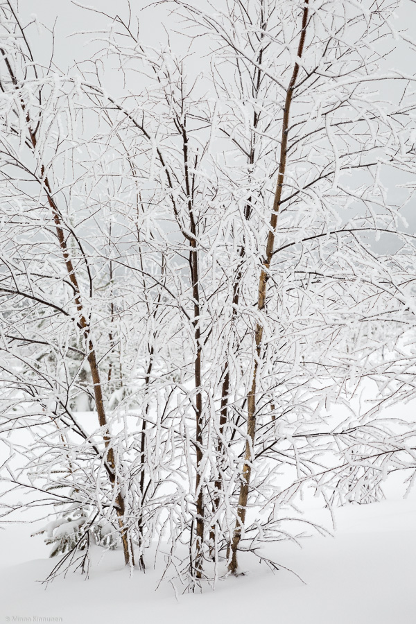 I haven’t done any skiing in many weeks, since I came to the conclusion that there’s no good skiing to be done in Föne. But that’s just the photographer in me speaking, because I’m not tired of skiing in itself. So in order to get back to skis, I drove to Kajevall yesterday. They have a few trails, the longest is 10 km and that’s what I did. The tracks were newly prepared but it was was snowing a little bit, a cold powder snow which makes for poor glide so it didn’t go very fast, I had to push with the poles to get any speed going in some of the smaller slopes. But that’s ok, I’ve never been a friend of fast skiing and it turned out that this ”milspåret” trail was pure eye candy as well so I was in no hurry in any case. But even if the landscape was very pretty to look at, it didn’t provide any real highlights that would stick out as obvious photo opportunities, so I didn’t have to get the camera out very much. On the mires which provided the most potential, my experience with the ice was spooking me so I didn’t dare to go outside the prepared trail in the soft snow. The thing with mires is that it’s not always ice underneath the snow, it can actually be water as well. Same difference – risk of sinking! But regardless, as a skiing trip it was one of the better ones.