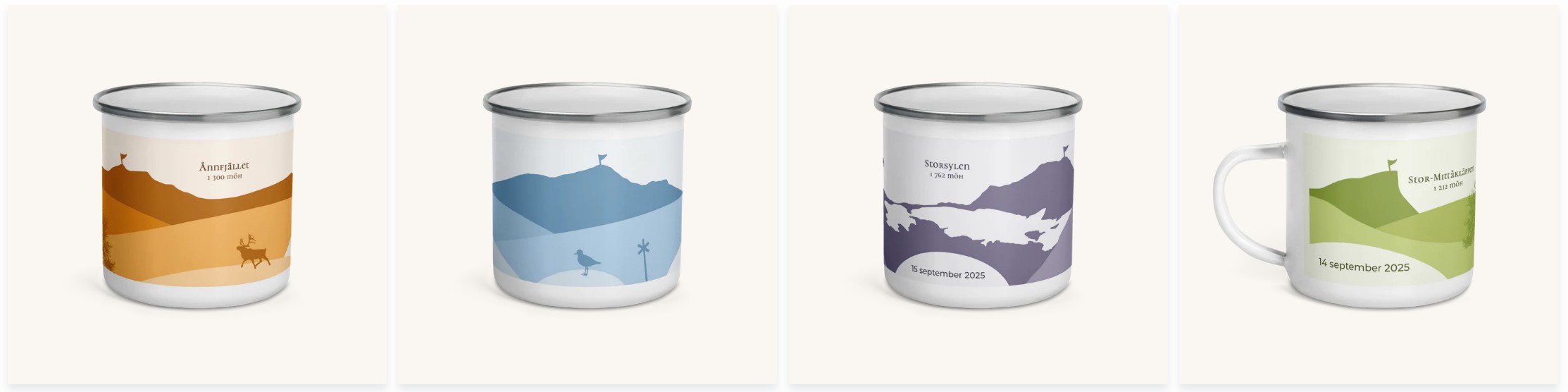 Fjälltopp består av illustrationer av omtyckta toppar i våra fjäll. Just nu finns designen på emaljmuggar, men i framtiden kommer topparna att dyka upp även på andra produkter. En mycket spännande produkt jag testar just nu är en svart keramikmugg. Grafiken ser häftig ut mot den mörka bakgrunden! Alla produkter i serien kan du personalisera genom att du väljer egen text. Vid köp av minst tre muggar får du dessutom 10 % rabatt. Hur många av topparna har du bestigit?