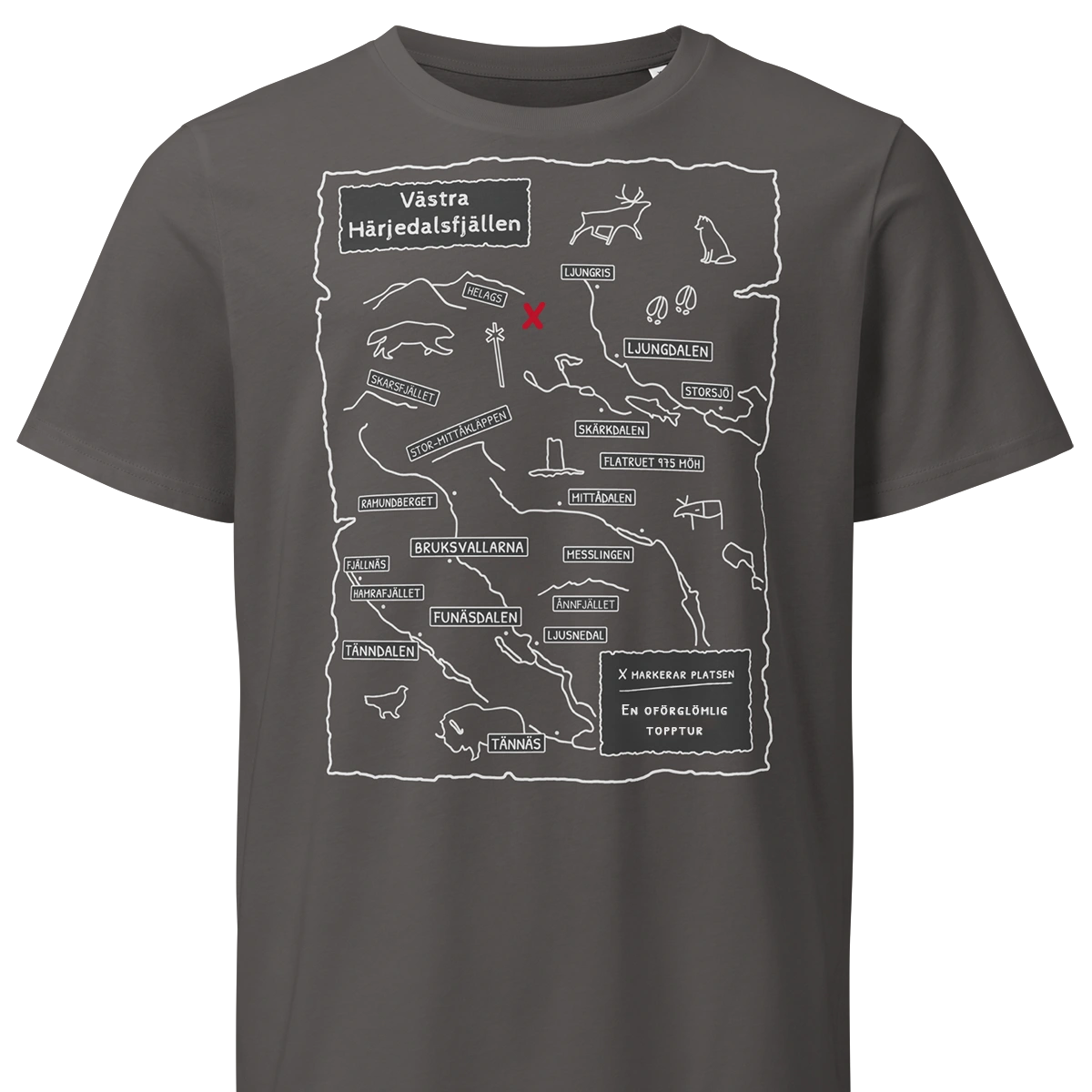 Fjällkartor krävde mycket arbete, men det var mödan värt. Serien består av tre handritade kartor: västra Härjedalsfjällen, södra Årefjällen och Jämtlandstriangeln. De två förstnämnda kan göras personliga, du kan välja både X:ets plats och texten som hör till. Designen trycks på ekologiska t-shirtar, men Härjedalsfjällen finns även som väggtavla. Om efterfrågan finns kommer jag att använda designen på fler produkter.