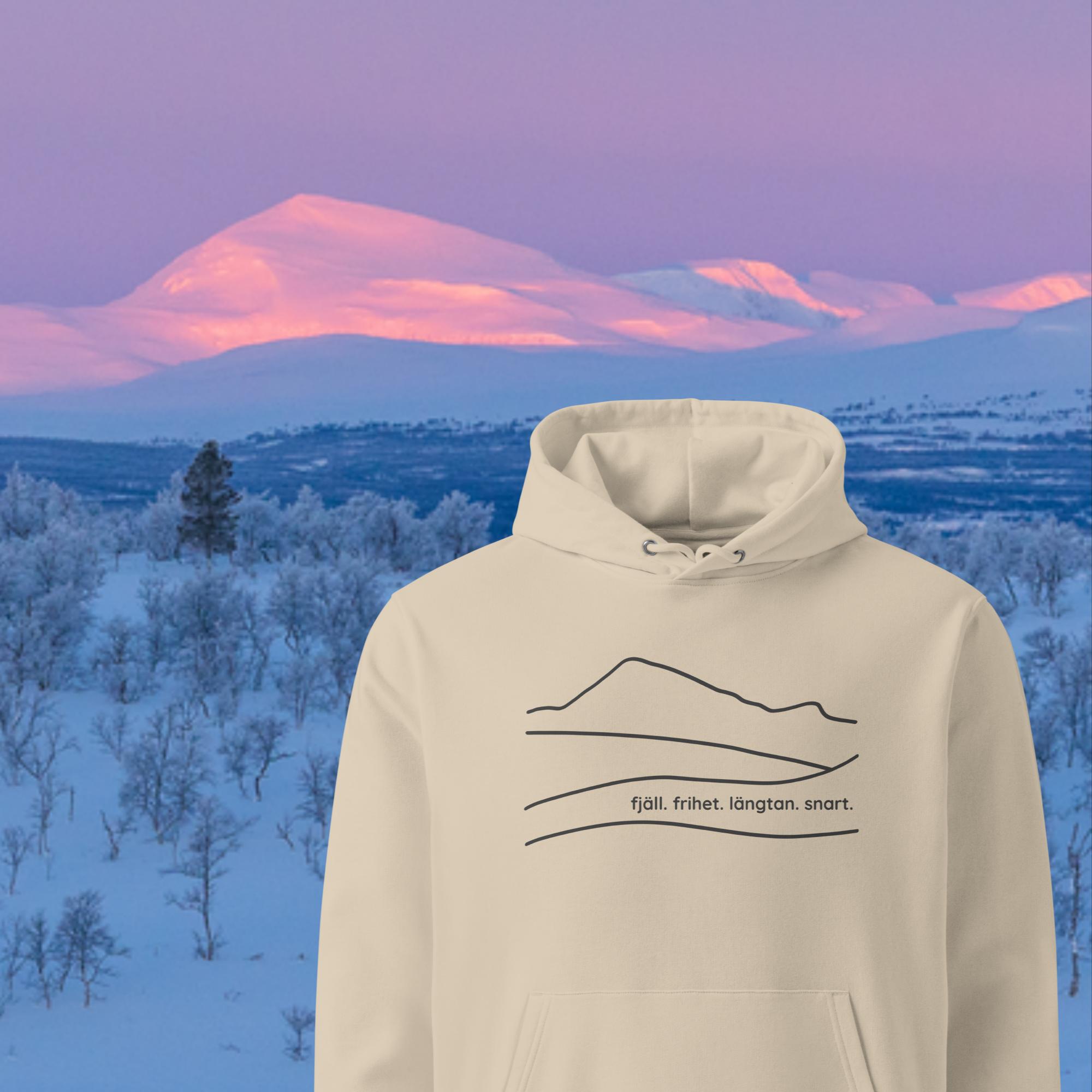 Fjällfrihet är serien där allt började. Den första designen jag skapade för butiken var Ånnfjället. Grafiken är stilren och består endast av linjer, där fjällets profil och dina egna ord får ta plats. Fjällen i serien är Ånnfjället, Skarsfjället, Predikstolen och Stor-Mittåkläppen.