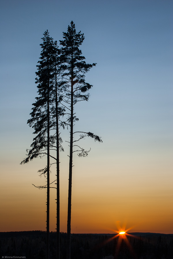 Last day of the long weekend. I was out before sunrise, walked up Furuberget again. That’s 3.5 times in 3 days… other people normally take the lift up… Anyway, I observed that the snow has melted away from the trees on the high hills, for example the tall pines on the Eagle Mountain are now bare. Strange… there hasn’t been any wind to speak of and it sure hasn’t been warm. Must be the sun shining on these trees all day. Then in the afternoon I went skiing again, and for the first time I had the camera with me (on skis, that is, obviously!). I wanted to check if there’s any sunset photo ops now that the forest has been cleared south-west of the tracks so there’s a clean view, with three tall pines in the middle of the clearing to provide foreground interest. When I was halfway the ski round, I met a local and as is the custom here, we exchanged a few words. Only it was more than just a few words, we talked about Los and the nature and skiing and I explained that I’m a bit less than gracious on skis since I only picked up the sport recently, but at least I have stayed on my feet so far. He consoled me by saying that he has a relative who has lived in England and South Africa and he usually ends wrapped around a lamp post when he tries to ski here. The conversation went on to the point where I was worried that I might actually miss the sunset, but, standing still in the cold air gets to you so we parted ways before the freeze set in. So I made it to my sunset spot just in time and struggled with the tripod because one of the sections had frozen so I couldn’t fully extend the foot. Just as well for the uneven ground so I could place the short foot higher than the two others and thus had a steady platform to shoot from. It turned out that I had been a bit too cautious in my estimate about the spot – it was just perfect, as the sun was setting right behind those tall pines (or right next to them, if you took a few steps in either way). Nice.