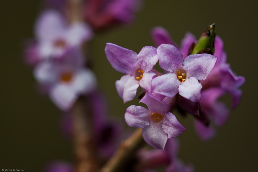 I was short on ideas on what else to shoot, I actually contemplated to skip the daphne because I’m starting to feel that I’ve done everything with daphne that I can and it’s not very inspiring to take the same pictures all over again. But then I figured that it doesn’t hurt to check them and it’s not like I had any better ideas anyway. And oh boy was I happy that I didn’t give up on them! I found this branch which made it possible to fill up the background with the flowers, instead of having to fill the frame with extreme closeups (like I did on Monday). Having done this, now I really don’t know what else to do with the daphne… but at least I learned that it’s worth checking, because you never know what surprises Mother Nature will throw at you.