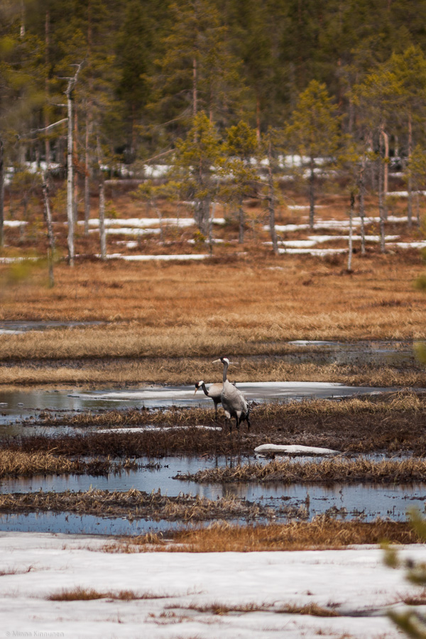 In the afternoon we made a major effort to find cranes and other migratory birds. I’ve been a little bit perplexed that I haven’t seen the big crane flocks in Veckebo that normally are there every year, now it’s only been a handful of cranes in the distance. And when we were driving around through all the big fields around Ljusdal, all we saw was one pair of cranes! Since I don’t think there’s been any major drop in the crane population, the only conclusion I can make is that the cranes’ breeding wetlands are open enough for the cranes to move straight home instead of gathering in the fields while waiting for the thaw. Proof of the point, there’s a pair of cranes in the marshland in Kullas (the highest point on the road between Korskrogen and Loos) already. They nested there last year and I wondered if it really could succeed. They don’t seem to mind the traffic, but I’m fairly sure that somebody got out of the car to take a closer look. The cranes have a zero-tolerance policy about people and sure enough, the nest was abandoned before the baby hatched. On the other hand, it’s normal that a crane couple would have a failed breeding attempts in the first years they’re together. So provided that people leave them well alone, maybe they’ll succeed this year?