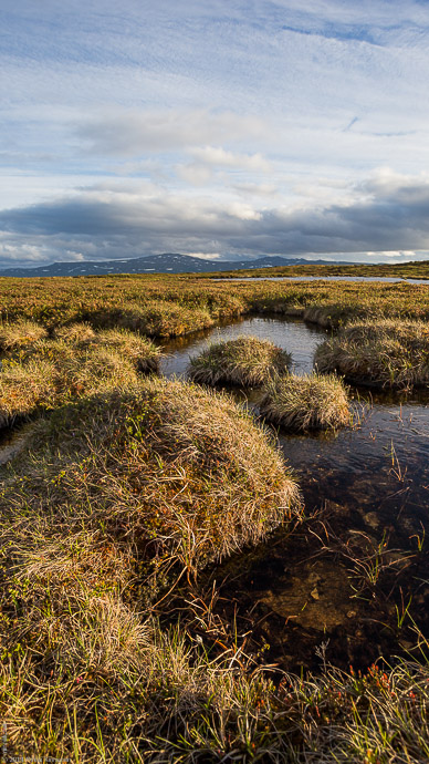I went up towards Fiskhålsgraven but turned west after reaching the tundra, the idea was to use the small pools of water as a foreground and Blåstöten and Ånnfjället in the background. But the wind was so bad it was whipping even the small puddles, and there was no light on the distant fells, and one thing I had forgotten – the horizon slopes on Flatruet. So whatever you do, it’s almost impossible to avoid the impression that the picture is tilted, even when it’s perfectly level.