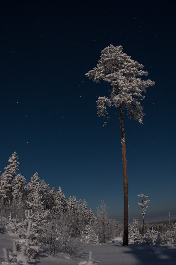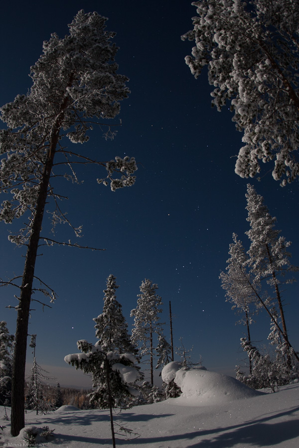 Thanks to the solar eruptions earlier this week, there was a fair chance of seeing some aurora. I was looking at the aurora forecast all evening yesterday but unfortunately it didn’t look like we would get any northern lights this far south. But since it was a full moon night and the snow cover was looking good, I decided to go for a walk anyway – if I didn’t see any aurora, I would still have all the stars and the moonlight on the snow. It was -20 degrees centigrade so I dressed up warmly, grabbed the snowshoes and set out. Walking through the snow, I was almost sweating under all the layers… even when I stopped to take some pictures, the cold didn’t bother me until I had been out for over an hour and spent more time on stopping and shooting than walking. But still, it was the camera battery that gave out first and I turned back home.