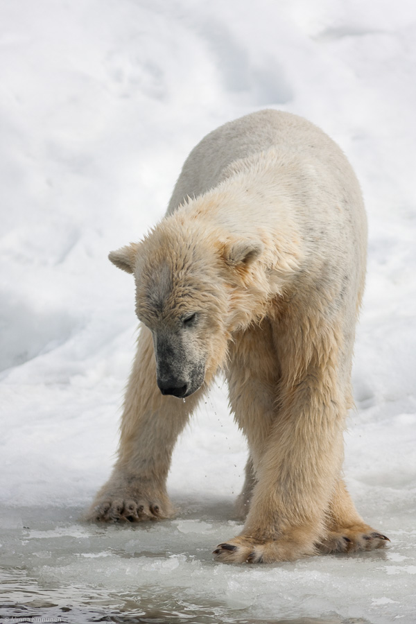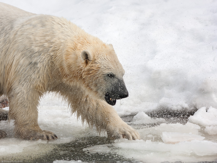 The polar bears were in a playful mood. They have an open pool of water that still has some ice cover left, and these two bears decided to reduce the ice cover and started hopping on it until a big raft of ice broke off, making a nice new plaything for them. It was non-stop action with the polar bears so it was hard to keep the pace, especially when I had to nail the composition because the bears were close enough to leave me with a tight framing. Normally I like tight frames, but I would’ve been happy with less of a challenge to nail it in camera… however, it was very nice to see the polar bears, this is only the second time I’ve ever seen them.