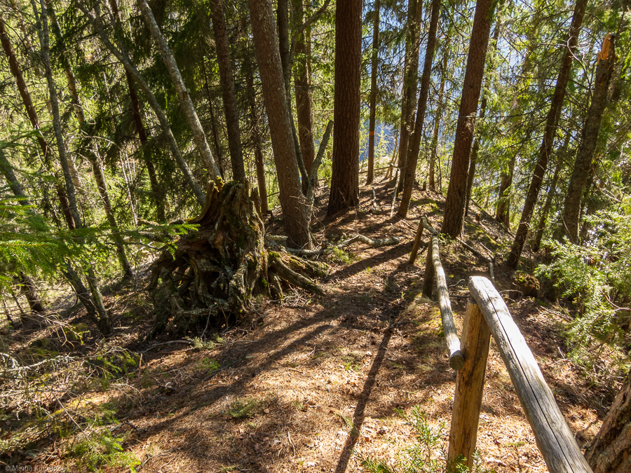 I wanted to check out some of the riverside features, so I took a tiny little side road. Of course, that road was covered with fallen trees as well, but I got there in the end. The Ljusnanleden trail follows close to the river here, so I followed it to see what I could find. I found a steep embankment where the trails goes all the way down to the water. The embankment is about 35-40m high at this point and got me wondering why the storm only uprooted the trees across the road and not here where it would’ve created an open view… Anyway, the trail was tricky at first with the pine needles and cones rolling under foot. And then it got worse. Even steeper, and now covered with fine sand. I mean, there’s steep and then there’s steep. Any steeper and they might as well put out some parachutes and let people jump down! There’s a railing though, which is starting to rot badly and in some places it had already fallen down, but it provided some support anyway. Mostly I just glided from tree to tree and hung on for dear life. On the way up, without that railing you’d have to get down on hands and knees to get a safe hold. Not kidding!