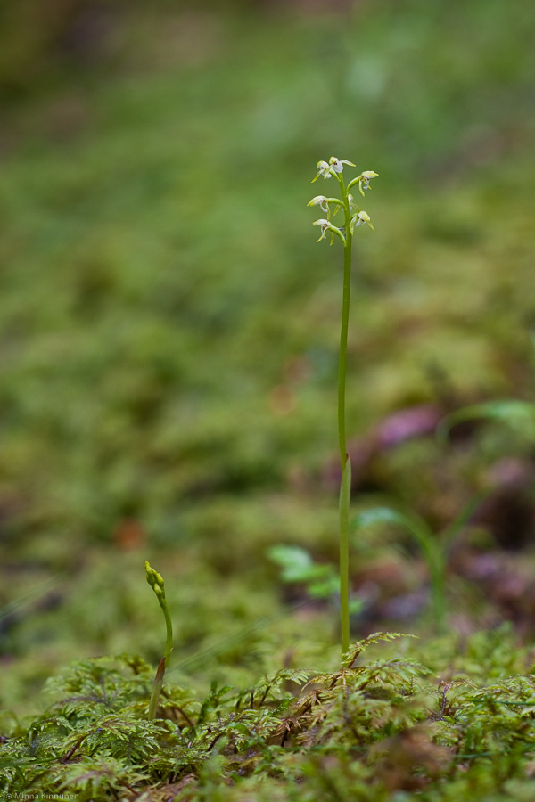 My mood didn’t improve until later when I was walking around in my local woods, checking the two spots of lesser butterfly orchids here. They haven’t opened either and I was ready to give up on this gloomy day, when something caught my eye – an early coralroot! This is the first early coralroot I’ve seen in my local forest, and it was growing in an open spot which gave me an opportunity to take a picture of it in its environment. Granted, not a good picture, but it gives an idea of the environment. And having done that, I changed my angle to get a diffused foreground and background which brings up the modest flower and leaves the rest to your imagination. Maybe this is a ketchup effect… until last Sunday I didn’t have any early coralroot pictures from Loos, and now I find them so close to home!