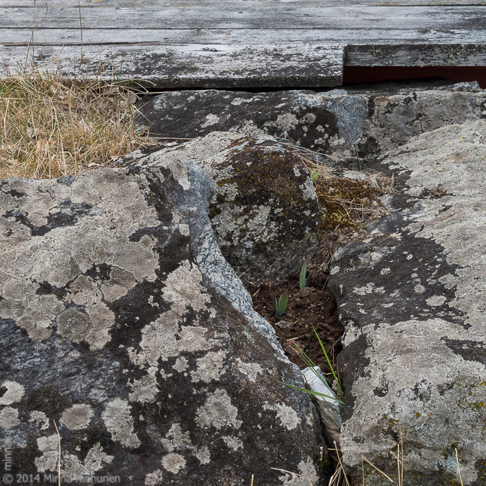 Last autumn when I was planting the bulbs, I had a few of them over so I just put them anywhere I could find, as unlikely as it seemed that they would survive. This ramp with rock walls is one of them, the ramp leads to a barn and the first half of the ramp is supported by rocks, as was the custom back in the day. There was a hole between the rocks so I filled it up with soil and put in 2-3 bulbs and oh joy when I saw that they survived the winter! The only problem now is that with the cold weather, nothing is happening. But today I finally saw that there is a tiny little bud coming up, so as soon as the days get warmer, I will have some flowers here. Nice!