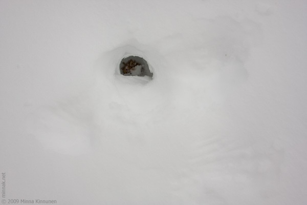 When the wind quieted down yesterday afternoon, the snowing took on. So we now have a new layer of fluffy snow, it’s past knee deep as I found when I took a short cut through the forest… but despite that, it’s fairly easy to walk through because it really is airy and light. And then I came across some strange holes in the snow, figured it must’ve been a bird because there were no tracks leading to or from the holes. Until I found a hole which hadn’t caved in yet and saw grouse droppings at the bottom – it’s as good a snow cave as I’ve ever seen (=the first snow cave I’ve ever seen)! With the snow as fluffy as it is, it must’ve been easy for the grouse to create the cave and then break it open in the morning to fly off. You can just make out the wing depressions in the snow.