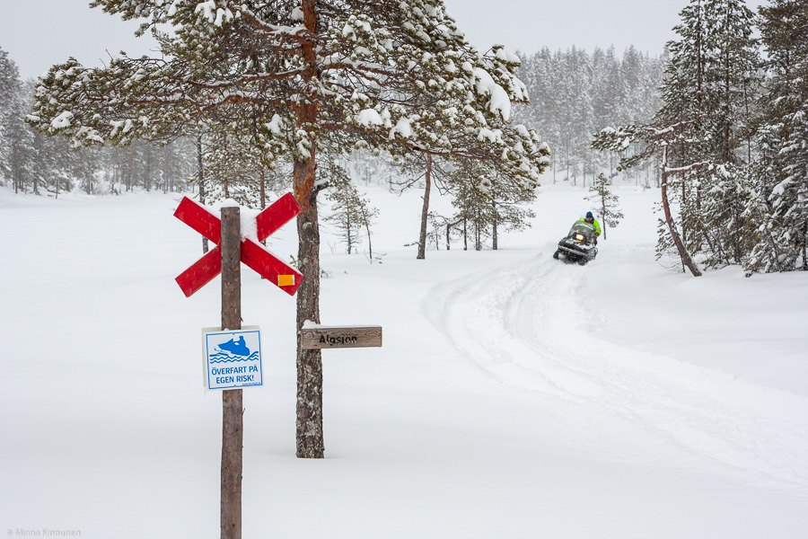 Every time the trail crosses a lake, there’s a sign warning the snowmobilers about the risk of weak ice. I’ve been meaning to take a picture of one of these signs for ages now, but never gotten around to it until now. So there I was, trying to figure out the best way of including the trail and the signs in the frame, when I heard another snowmobile closing in. The timing couldn’t have been better – I didn’t even have to change my composition to get the approaching snowmobile in a perfect position. Sometimes it’s more luck than skill… I think I saw only four snowmobiles in total, so having one of them arrive right at that moment was a bit of fluke. Oh and I’m happy to say that he was one of the responsible drivers as well, not tearing up the engine or the trail!