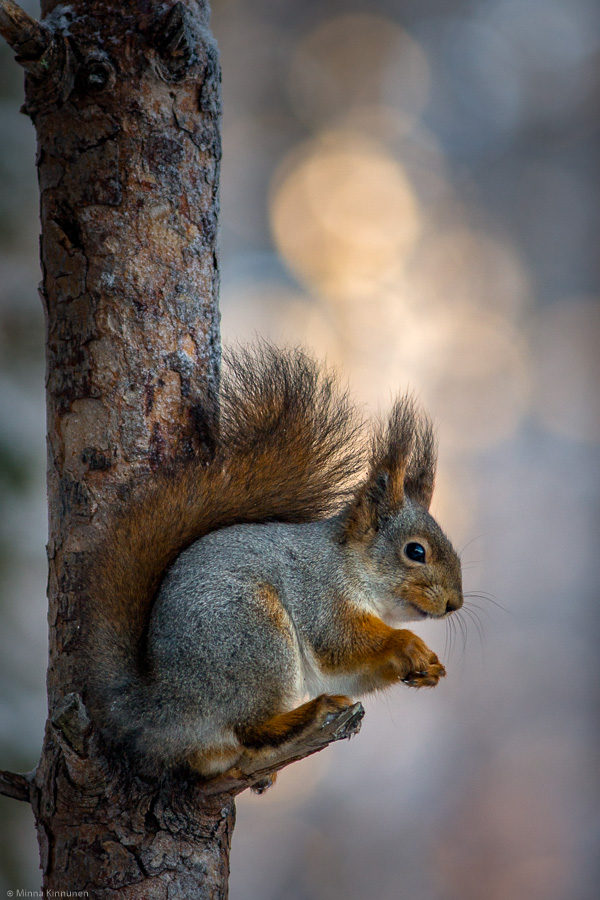 I have two problems with my squirrel perches. The biggest problem is that they are shaded most of the day so light is nearly always at a premium. I’m lucky to shoot at ISO 400, 200 hardly ever and let’s forget about ISO 100. But then when there is light, it is also a problem. It creates bad highlights in the background and now that there’s snow, the highlights are intolerable. Especially at this time of the year, when the sun never seems to reach the squirrel perches and if there’s one thing that doesn’t work, it’s a shaded subject and over-lit background. But today in the early afternoon, some muted sunlight reached the forest while the ambient light was sufficient for the squirrels, so I got a combination where the highlights were manageable.