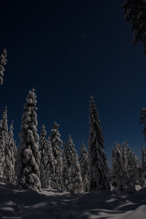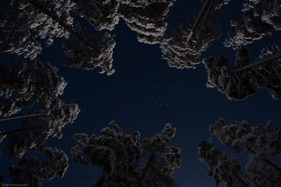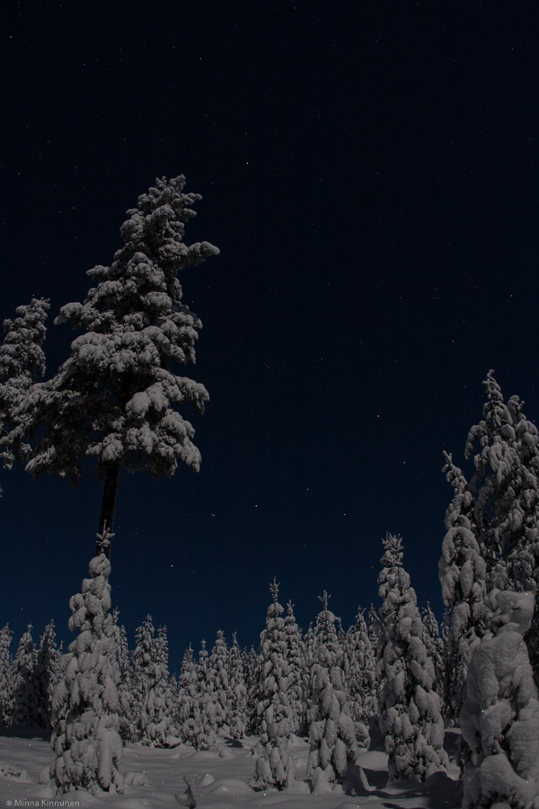The weather has been very much overcast lately so I haven’t had a chance to try out my star 15 theory until tonight. Full moon is on Friday but there’s plenty enough light to go around already, I hardly needed my flashlight in the snow covered forest. It made composition easier as well because it was actually possible to see through the viewfinder, the only thing I was left wanting was a swivelling LCD because now I had to keep kneeling under the camera to look at the display… but that’s nothing. I had such a great time, the thermometre said 12 degrees below but I was warm and cosy as I kept walking around and pointing my camera up to the sky!