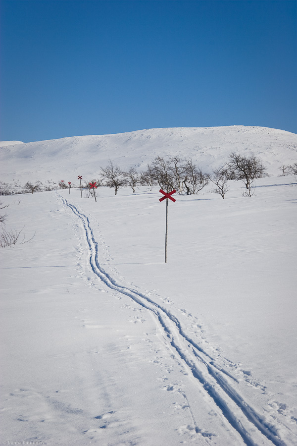 Yesterday at the library I noticed that they had a freebie magazine out for grabs. ”Fjällsäker” (Safety in the mountains) is an annual publication intended for tourists to educate them on how to dress warmly, watch out for the changes in the weather, avoid avalanche prone areas etc. Since I read everything about the mountains I can get my hands on, of course I grabbed a copy of this. Page 17 is dedicated for maps, and in the lower right corner there’s an ad for Fjällkartan (mountain map). Click here for the PDF, and go to page 17. I thought the picture looked very familiar. Hmm.. a winter landscape from the mountains with ski tracks… it’s an ad from Norstedts… could it… yes it is! That’s my picture!!