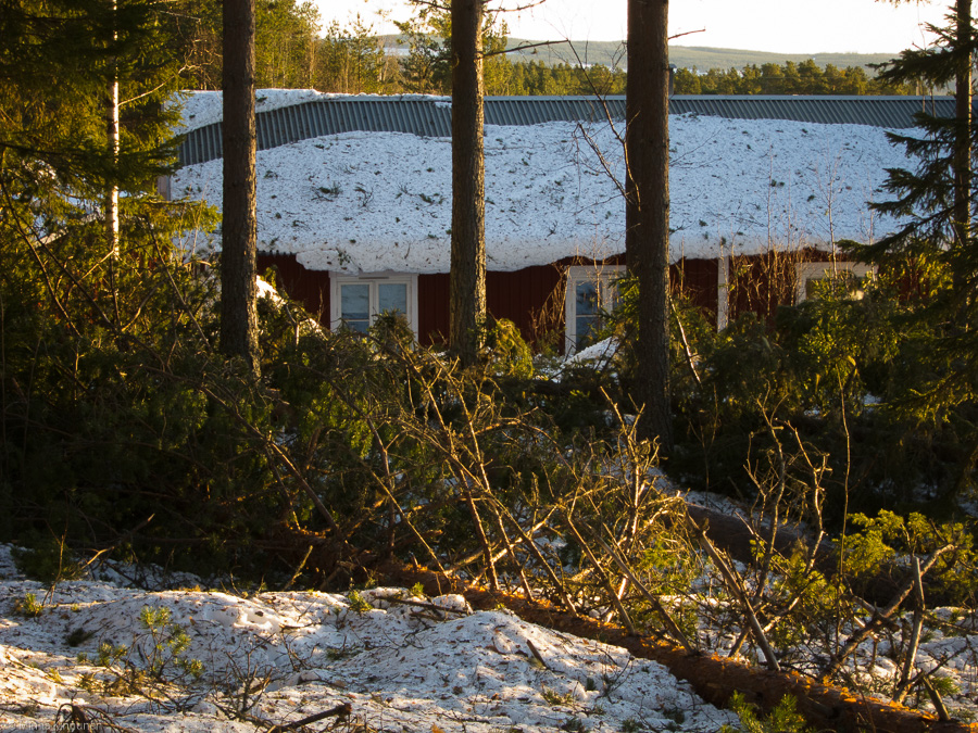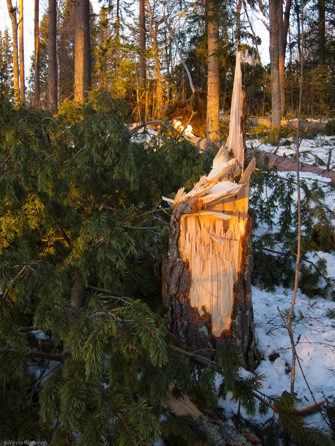 In the morning as soon as there was enough light, I looked out the window and saw that a tree had fallen outside the bedroom, almost touching the house. I went outside and found almost total destruction – well over half of the trees in that part of the forest had fallen or broken off. More so, the direction they had fallen was north-south, which means that they had all come down towards the house! I was happy about the earplugs… had I heard what’s going on, it would’ve frightened the living daylights out of me for sure. This forest closest to the house, they did some logging here a couple of years ago so the forest wasn’t very dense to start with, thus making it more vulnerable to the winds. And now it’s obviously even less dense and the few trees that are left standing are probably weaker than they were before. Which means that when the next storm arrives, there’s a big risk that more trees will fall even without a tornado. There is safety in numbers, but those numbers don’t exist any more.