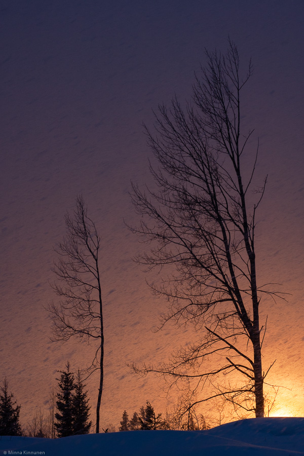 Wasted day off… the sunrise disappeared behind clouds and the snow disappeared from the trees by the gusty winds. I couldn’t have been less inspired to do anything but I finally forced myself out to scout for a certain location. Having done that, I just hoped that the sunset would be interesting because the sky was partly clear. So I went out about an hour before sunset, only to find out that it had started snowing while the sun still shone through a gap in the clouds. It was surreal… I had hardly any time at all to find a spot, so I settled with any composition. At first the sun was still too bright and I tried bracketing for HDR but after a minute or so the sun had faded enough to get it all in one frame. Creating a HDR with these big snowflakes flying around the frames would probably have been impossible anyway (I didn’t even try, just ditched everything but this last frame which worked on its own). It wasn’t really even a sunset… it was just an orange globe quickly fading behind the clouds.