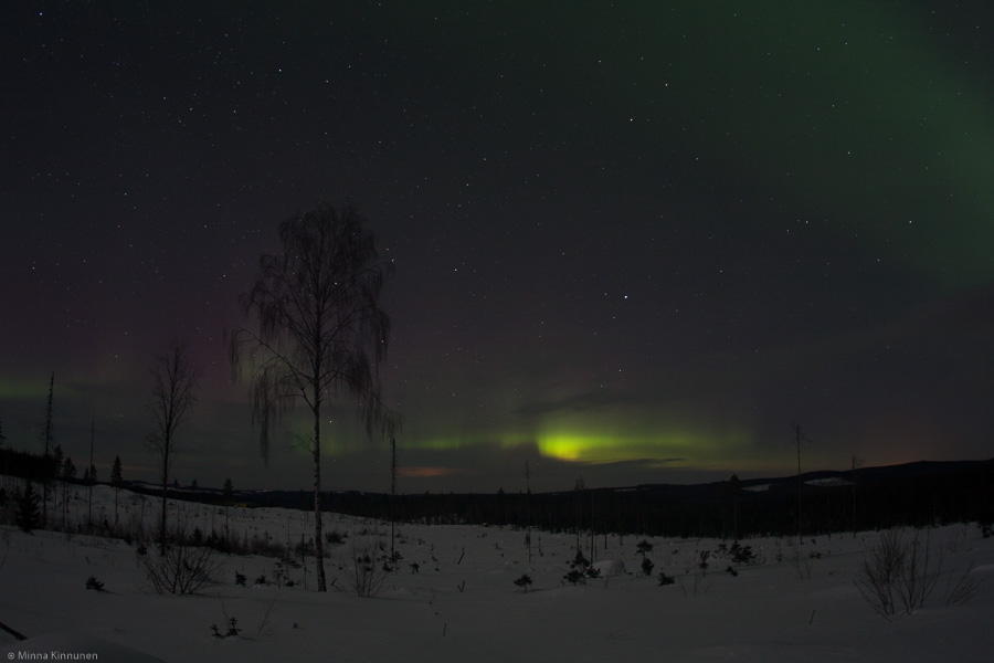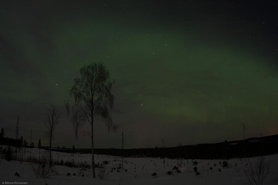 My usual spot (even if it’s not very good) is at the skiing track. We have the luxury of electric light on this track but hardly anyone ever skis there at night. Except tonight – it was lit. Horror! I had no chance but the walk a bit further; there’s a deforestated spot on the other side with an open view north. The only foreground interest at this spot is a lonely birch with hanging branches but at least there wasn’t a lot of wind so I got away with it. The sky was almost clear but I was looking at these things in the horizon and couldn’t quite make up my mind what it was. High cloud? Auroral glow? It all looked grey to me, but I knew that a long exposure would extract some colour in the scene if anything existed. So I took a shot and looked at the LCD and sure enough, it was greenish! (Yes I know that AWB and camera LCD is hardly a reliable source of information, but a comparison to the snow told me that there’s a difference.)