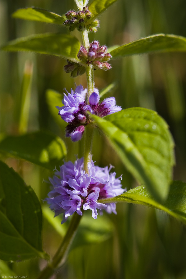 Since not many people seem to enjoy the morning hours, I was fairly sure that I could photograph the flower I missed yesterday in peace and quiet this morning. It was a lovely warm weather for cycling and when I got to the lake, I found that the sun hadn’t quite reached the flowers yet, making me wait for a moment. I didn’t mind this at all – it really doesn’t get much better than sitting down by the lake with the sun warm on your face. Even the horse flies and mosquitos hadn’t woken up yet so I was really able to relax.The flower, by the way, is Mentha arvensis (corn mint / åkermynta / rantaminttu).