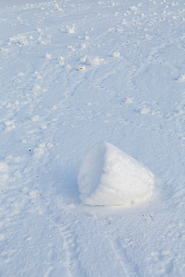The picture has nothing to do with this story, I just realised that I only posted this on Facebook two weeks ago. It was a weird and unusual phenomenon, I had never seen it happening before. It had snowed in the morning hours and during the day the temperature got just above freezing, meaning that the snow was sticky. In the afternoon the wind started blowing really hard, I had trouble standing still when I took the pictures. But with this loose and sticky snow, the wind picked it up and started rolling it so that the field was covered with snowballs! Or as in this case, a perfect snow cone. The next morning almost all of the snowballs were gone; with the temperature dipping below zero, there was no more snowball effect and wind just broke off the snowballs it had created before.