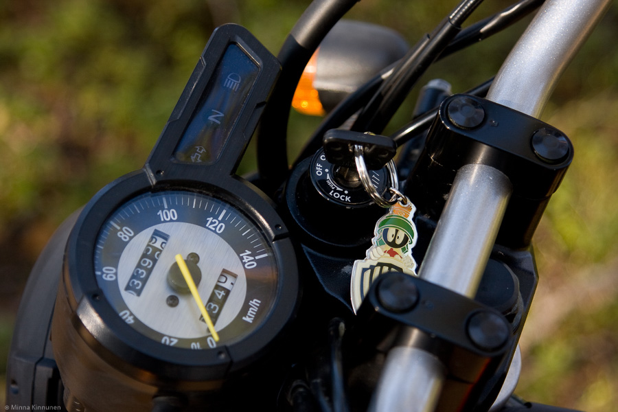 Later in the afternoon I swapped the bicycle for a motored version and took out the Tricker for a longer ride. I wasn’t sure how comfortable it would be to ride for 30+ km at one stretch, but it turned out to be just fine – I had mostly worried that my hands would go numb, but there were no such problems. In fact, the biggest worry turned out to be my cornering (no surprises there, really). When came into a sharp curve, I was horrified to notice that I was heading awfully straight in relation the curve in the road. Problem was of course that I wasn’t leaning enough, but I had enough presence of mind to release the gas so I managed to stay on the tarmac, if with the smallest of margins. The funny thing about this curve is that I always seem to misjudge it – winter and summer, I find myself breaking in the middle of the bend when I’ve once again driven too fast into it. And it’s not like I don’t know that the curve is there! Anyway, this one almost-mishap aside, the ride went smoothly and it feels like I’m getting more and more confident on the bike after every trip. At one point I even caught myself thinking about something completely else than the bike and the road!