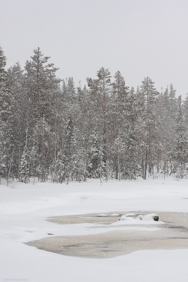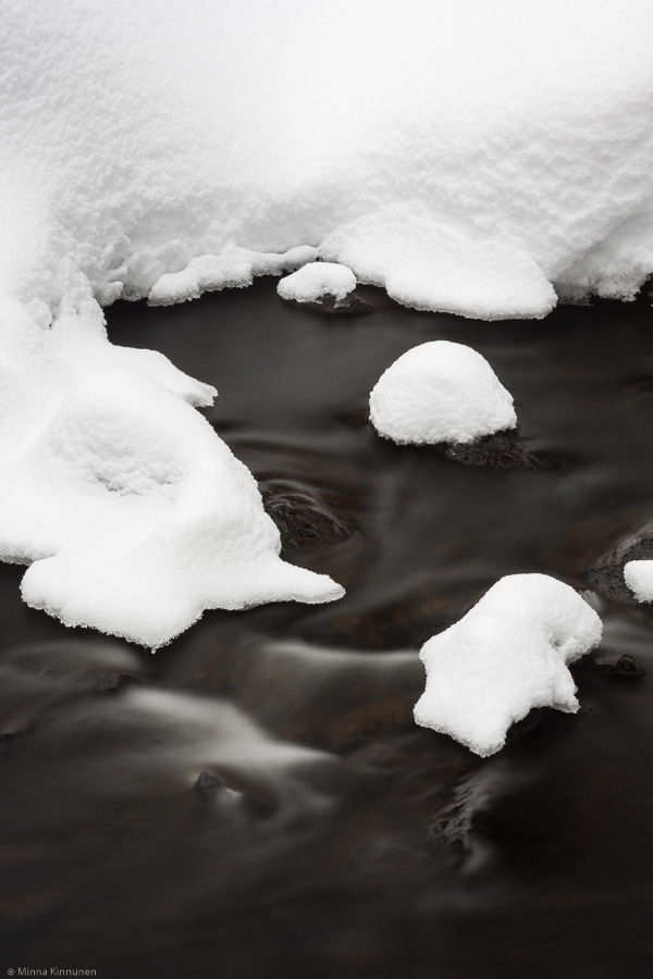 The temperature was at zero, it really limits my excursion options. The problem is that the snow sticks to the snowshoes so you end up walking with a 2-kg lump of snow under each foot, which tends to dampen your enthusiasm for long snowshoe walks. So I opted to take the road instead and walked to the Kvarnsjön lake which usually never fails me. The creek was open with pillows of fresh snow on the rocks so I got my photo ops, the biggest problem was to keep the falling wet snow off the camera and the lens. At least I had had the foresight of mounting the ND and pol filters already at home.