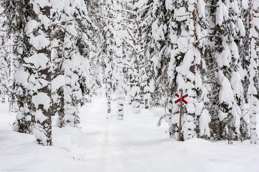 The trail from Kvarnsjön to Ryggskog is not used a lot. I can’t remember if I’ve ever seen a snowmobile here, but they do drive the route occasionally because the tracks are there. Except now of course, nobody’s done the trail since the snowfall started this week, so I had to pulse through the new snow. It’s uphill almost all the way to Ryggskog, but I love the forest that this trail runs through. It’s a fairly dense forest, mostly pines but a good dose of spruces as well (which is the norm around here). Because of the closeness of the trees, you’ll often see snow here when it’s already fallen down from the trees everywhere else. I haven’t found a way to photograph it so I could do it justice, but as an experience to hike through this forest it’s just simply wonderful. For me it’s a mile of pure winter bliss! And today it felt like it was better than normal… I don’t know if I was stopping so frequently to catch my breath or to enjoy the sight and silence!