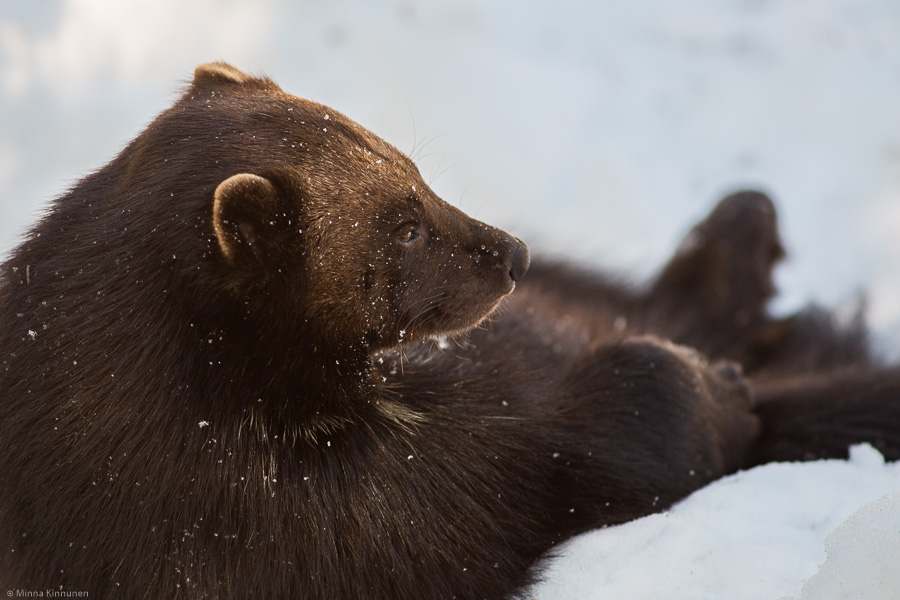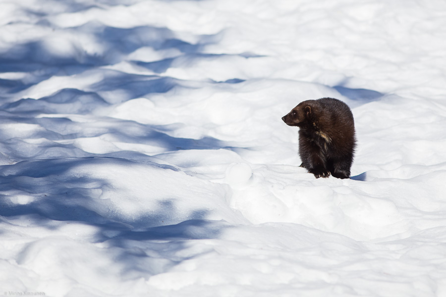 Things we looking much better at the wolverine enclosure. The male was in a very playful mood but incredibly difficult to shoot (moving too fast, too close, too far, too much contrast, too little light, facing away from me… you name it). Finally just before feeding time it actually stopped for a couple of seconds so I got a closeup, you can see the snow crystals in the fur after it had been rolling around. The snow itself wasn’t very pretty because of the weather in the past few weeks but I liked the blue shadows in the distance shot.