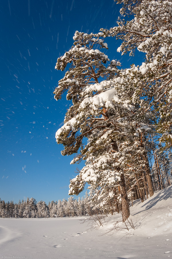 If January is good for the most wintery of winter scenes, then February can a bit of two things – it’s still winter, but you also feel the spring in the air. That’s what it was on this day when the sun was warm on my face but the scenery wasn’t looking nearly as nice as I had hoped for, when the wind had stripped the trees bare of snow. And then I found this pine that still had some snow on it so out came the camera. When I was standing there composing the tree, a gust of wind grabbed some ice crystals and they flew right at me, so I quickly pressed the shutter and hoped for the best. I saw in the LCD that I had caught the flying snow, but I would’ve liked to have some more so I waited for another gust. But of course it doesn’t work that way, so this one picture is all I got.
